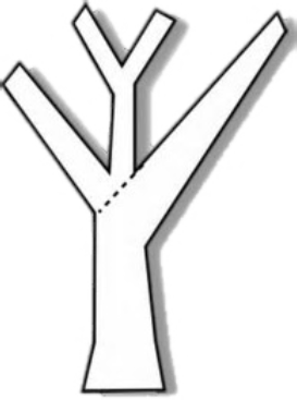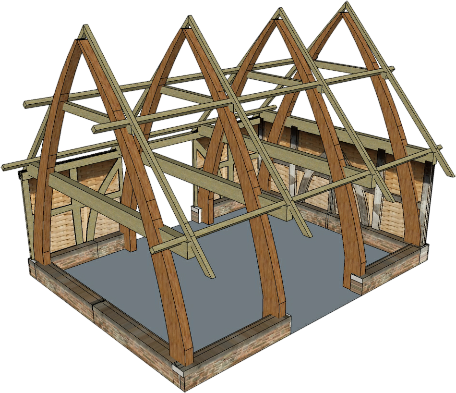 The method of construction involves finding a suitable tree with a curved trunk or trunk and large main branch. This is then squared and cut in half lengthwise to produce two matching cruck-blades. These are then erected to form an A-frame with a main tie-beam joining the two blades and projecting out to the level of the eaves.