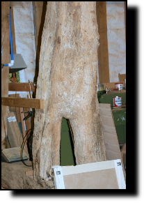 It has fine octagonal crown posts which support the central purlin. Three of the trees from which the aisle-posts were cut, were not quite as tall as their fellows and so were cut slightly higher in the crown. When the trees were inverted to create a jowl at the top it left the stubs of the branches at the base (inset).