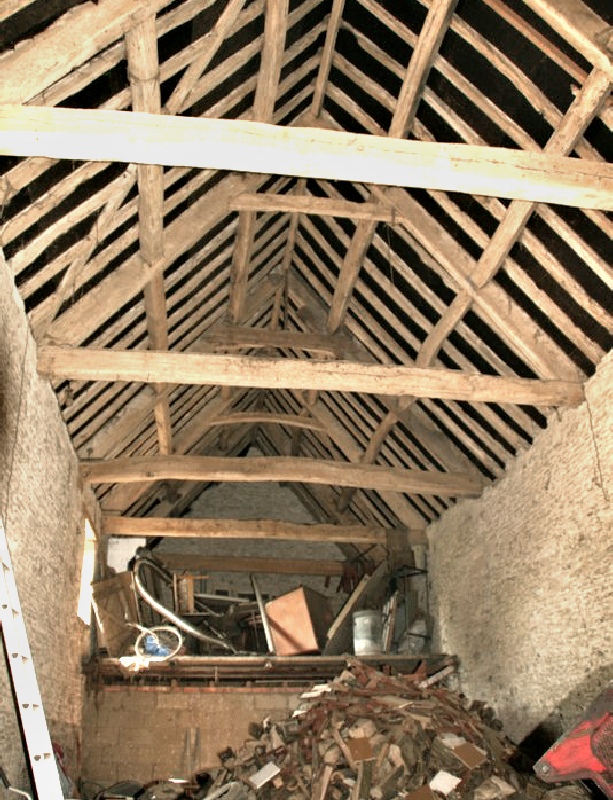 Inside there is a hay loft at one end with a ‘shove hole’ to allow the farmer to toss the hay in from a wagon. The trusses have a simple tie-beam with a collar-beam just below the upper purlins.