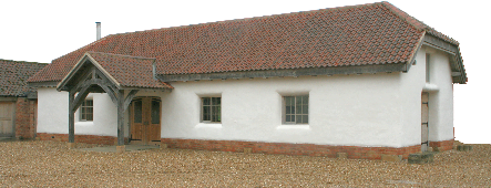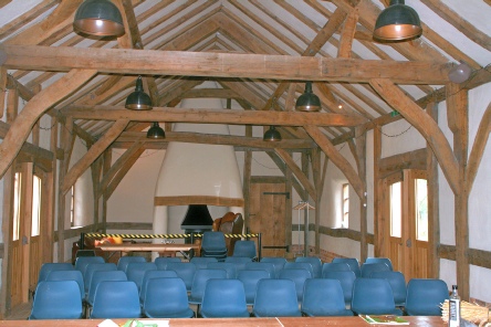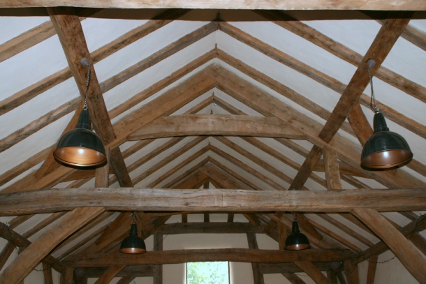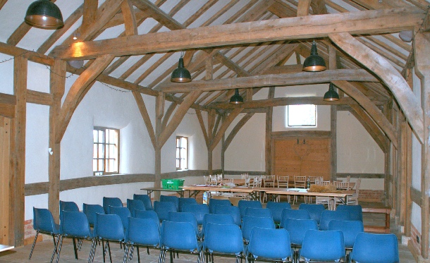 I also visited the wedding barn at Abbey Farm. This is a new build and there is a video of the process on YouTube. Apart from the large windows and a fireplace and chimney, this is an almost perfect reproduction of a traditional mud & stud barn. It is five and a half bays long with a central midstrey. It has jowled wall posts with arch braces to the tie beams and wall plates.