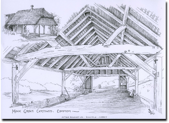 Their catalogue of dismantled timber frames is illustrated by their artist, Sarah Sullivan. Please have a look at their “Buildings for Sale” and “Buildings Sold” if only for the pleasure of seeing these lovely pen & ink drawings of the frames stripped of all the clutter we find in the average barn.