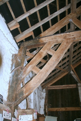 Inside, the mud has been removed from one side wall, leaving the studs in place. This clearly shows the method of construction. Of particular interest are the double, ladder braces from the wall posts to the tie-beams (below left). Note also the arched lintel over the doorway (below right)